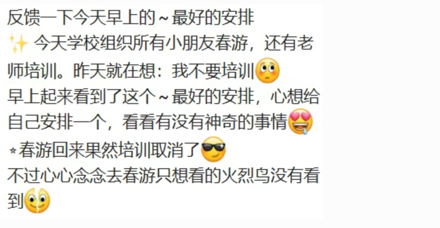 今天学校组织所有小朋友春游,还有老师培训。昨天就在想:我不要培训,早上起来看到了这个~最好的安排,心想给自己安排一个,看看有没有神奇的事情:春游回来果然培训取消了!